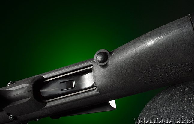 4. The stock assembly features a Remington Supercell buttpad that helps soak up some of the recoil from the compact 12-gauge scattergun.
