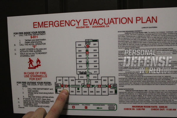 You should also take a moment to examine the floor map on the back of the door to determine the location of the stairwells. The first time you leave your room, actually take the time to go down the stairwell instead of the elevator so you know where it goes. In a fire, a stairwell that only leads to the outside is good. If you’re fleeing another emergency and don’t want to end up outside, a stairwell that leads to the lobby—and help—is better.