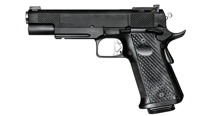 The Titan offers 13+1 rounds of raw firepower. Nothing about the Titan is subtle. The rugged night sights are recessed into the slide, snake scale serrations are positioned forward and aft on the slide, G10 competition grips, tactical rail, and a magazine well that swallows magazines whole. The triggerguard is squared off, giving the Titan rakish aesthetics and the trigger is flat-faced. Dan Wesson packs the full-size Titan full of features.