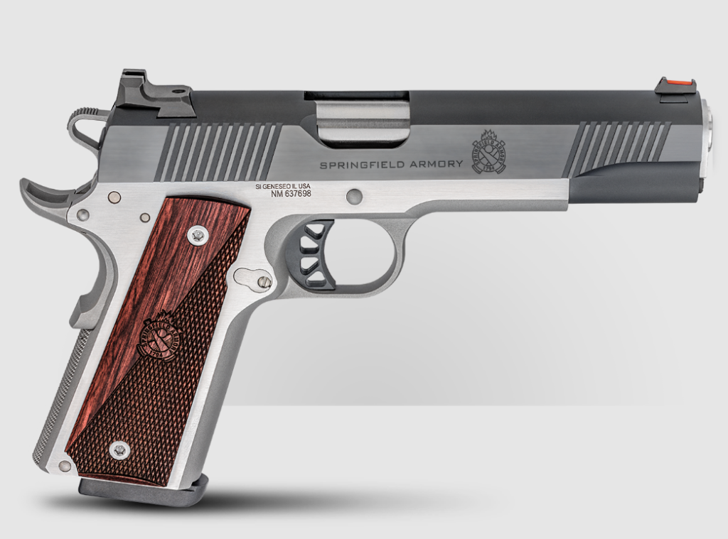 Springfield’s Ronin 1911 blends the classic style of a 1911 with more modern features. The forged carbon steel slide and frame as well as a hammer-forged barrel deliver optimal durability and strength. Meanwhile, its 40-ounce weight works hard to absorb felt recoil. To balance style with its substance is the presence of the hybrid smooth/checkered Crossed Cannon™ wooden grips for a more reliable hold.