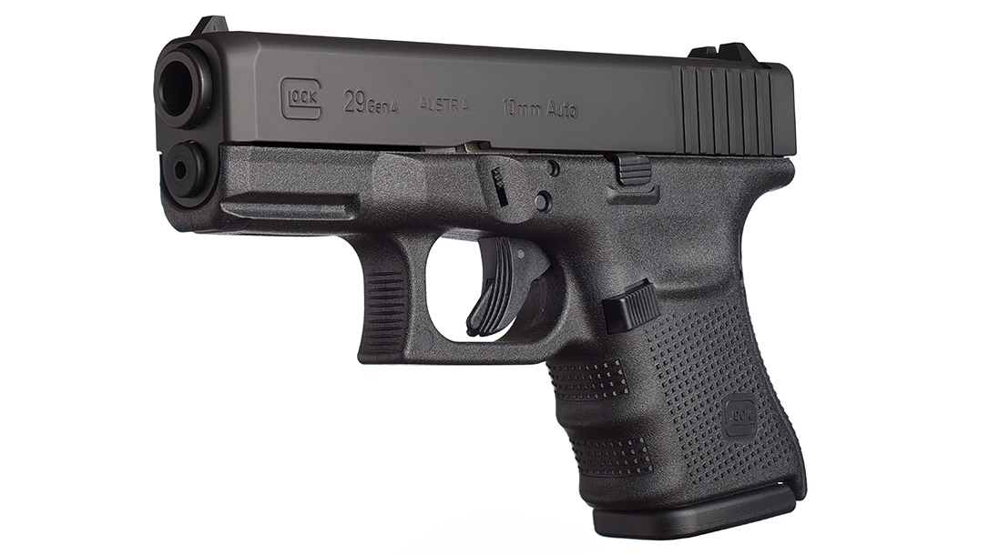 The Glock 40 also comes standard with red-dot mounting plates if you are looking to go that route. But even if you stick with iron sights, the Glock 40 offers the longest sight radius of the three Glocks tested. The Glock 20 offers the same grip but with a shorter slide. However, I became very fond of the Glock 29. Its compact grip frame held sufficient ammo, and its short slide really made it easy to tote around. The Glock 29’s short barrel also gives 10mm ammo enough velocity to ruin almost any animal’s day.