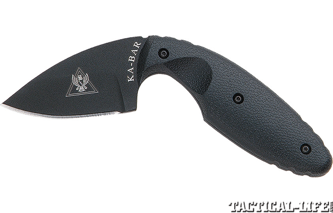 Concealed by the duty belt, the KA-BAR TDI law enforcement knife is worn on the inner belt and gives a police officer fast access to a lethal tool to help defeat a gun grab. The curved shape allows an officer to wield it easily with either hand. Its MSRP is $61.38.