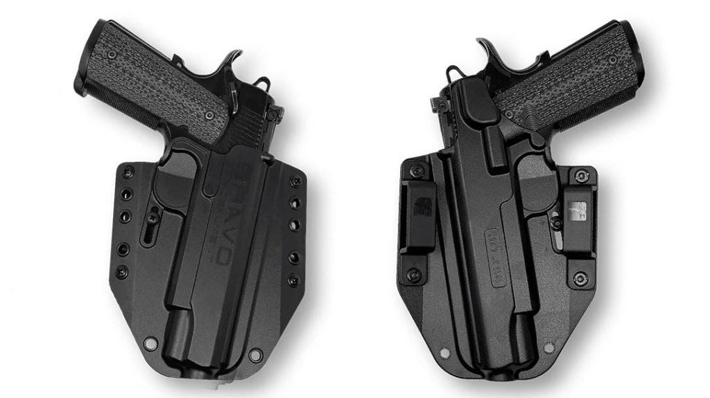 The holster features an open muzzle design to accommodate multiple slide lengths while retention straps keep your 1911 in place. Likewise, a dual mag pouch on the opposite side also utilizes retention straps and accommodates single or double-stack magazines. Finally, the open-top design of the holster itself is optics-compatible.