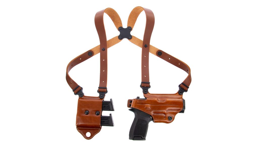 Rounding out the list of holsters for your 1911 is the Galco Miami Classic II shoulder holster. The premium steerhide leather holster features a spider harness carry system. Specifically, all four points of the harness pivot independently and are connected by a clover-shaped Flexalon swivel back plate. As a result, the harness system coupled with the 1 ½-inch harness straps provides all-day comfort.