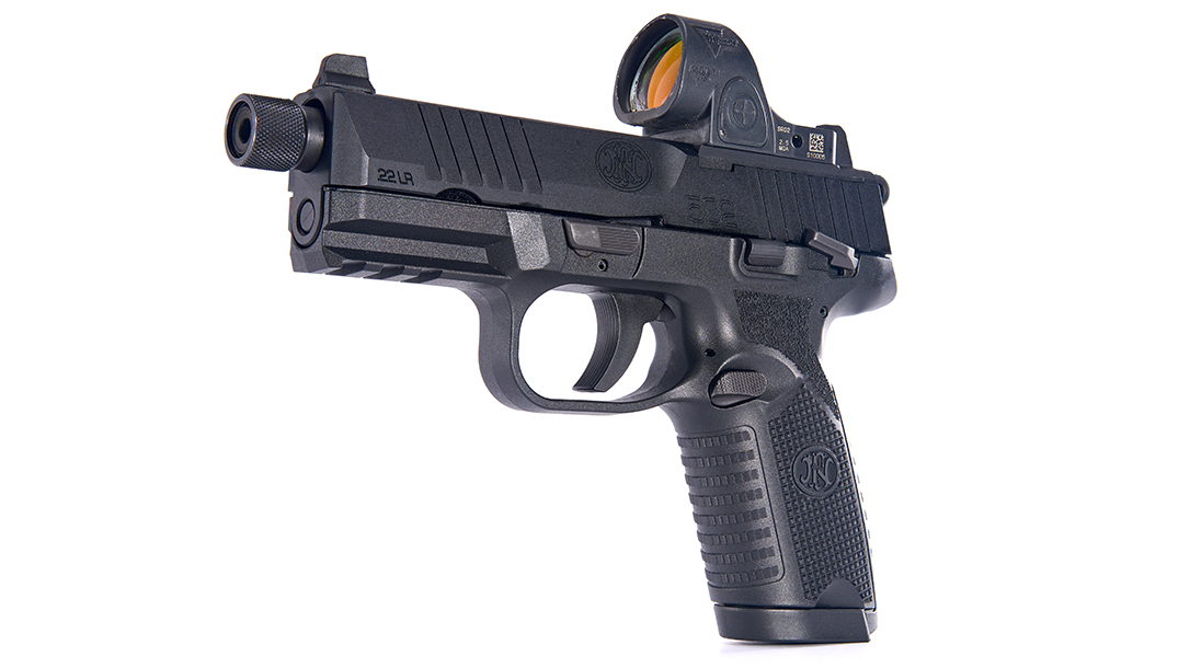 This hammer-fired .22 LR comes optic ready with a threaded barrel to mount your suppressor. Many of you recognize the gun as very close in appearance and size to its big brother, the FN 509. Like its centerfire counterpart, the FN 502 has solid ergonomics as well as ambidextrous controls. The slide is aircraft-grade anodized aluminum and steel. It has well-designed front and rear cocking serrations for easy manipulation as well as a loaded chamber indicator. In that FN designed the gun to run optics and a can, it comes with suppressor-height fixed front and rear sights. It ships with both 10-round and 15-round magazines. This is essentially a full-size gun and fits in most holsters made for the 509. This is not an accident, as the 502 is designed to be a rimfire trainer.