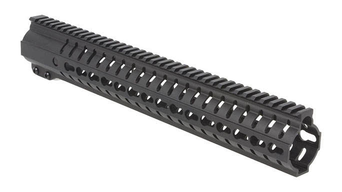 KeyMod slots are located in the 3, 6 and 9 o’clock positions while a top Picatinny rail runs the length of the handguard. The RKM15 floats freely and uses a proprietary barrel nut that comes with the rail kit.