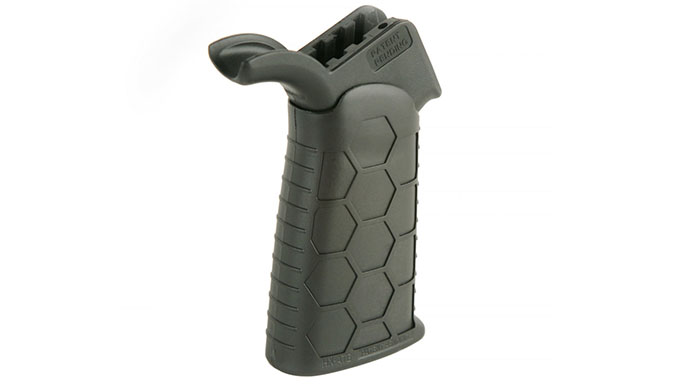 Hexmag ATG: Built from high-impact polymer and adorned with Hexmag’s hexagonal pattern, the ATG takes a very different approach to grip construction than its competitors. Most AR pistol grips consist of a grip and a securing screw. The ATG is a three-piece system with interlocking teeth in between the grip modules that are secured by a screw. The shooter can adjust the grip’s angle by loosening the grip screw and rotating the pistol grip to one of three positions: 17, 25 or 33 degrees.