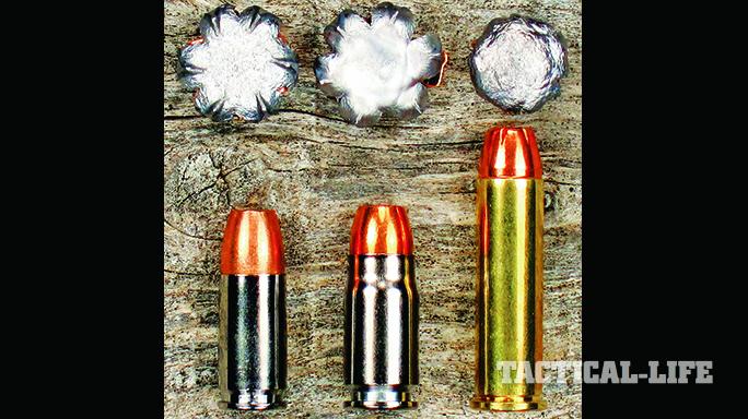 I also shot those two 9mm and .357 Magnum loads as well as Sig Sauer’s 125-grain .357 SIG V-Crown JHP ammo through a line of 1-gallon water jugs to test for penetration. So how did they stack up? Lining up those jugs in a row, the 9mm JHP shredded the first jug, perforated the second and came to rest in a perfect mushroom shape in the third. The.357 SIG JHP blew the first jug wide open, tore through the second and stopped in the third, again perfectly mushroomed. The Black Hills .357 Magnum JHP produced a small entry hole in the first jug, blew open the side while traveling through it and also ended up perfectly expanded, but inside of the second jug.