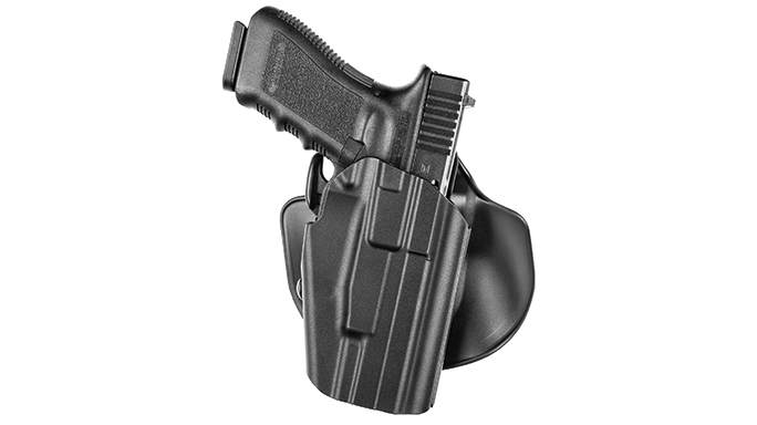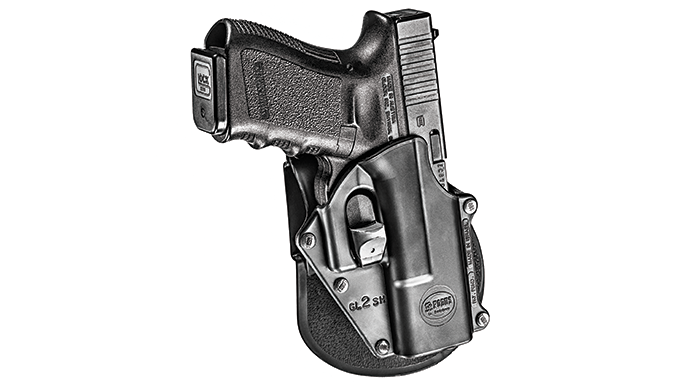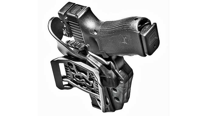 This very versatile holster, with its unique Grip Lock System (GLS), mates handgun retention with SafariSeven, a lightweight nylon blend. It can adjust to fit over 175 firearms, and its low-cut design makes it perfect for Glock MOS pistols. The Model 578 GLS Pro-Fit comes with an injection-molded paddle, but it can also be reconfigured for a belt loop or quick-locking holster fork. Gripping the handgun in the holster, the middle finger releases the GLS for an intuitive release. (safariland.com; 800-347-1200)
