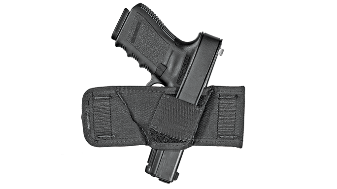 This “minimalist” open-top holster has dual belt loops that cinch the holster close to the body for maximum concealment and make it ambidextrous. Its outer material is 1,000-denier Cordura nylon, and it’s fitted with nylon belt loops that can accommodate belts up to 1.5 inches wide. It has an elastic retainer tab that helps secure the handgun but won’t interfere with a reflex sight. It is also very reasonably priced. (blackhawk.com; 800-379-1732)