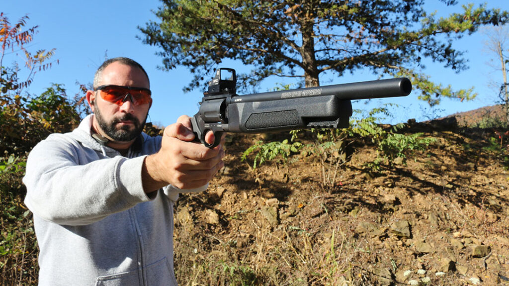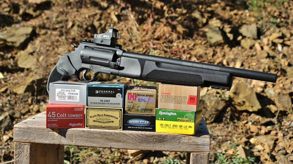 Timed nearly perfectly, Taurus introduced its latest Judge—the Home Defender. Despite its unorthodox stature, it had everything I needed to conduct this test. The 13-inch barrel is plenty long for a .45 Colt to reach its potential. Additionally, the Picatinny rail allowed me to mount a wide-lensed EOTech EFLX red dot for a concise, repeatable sight picture.