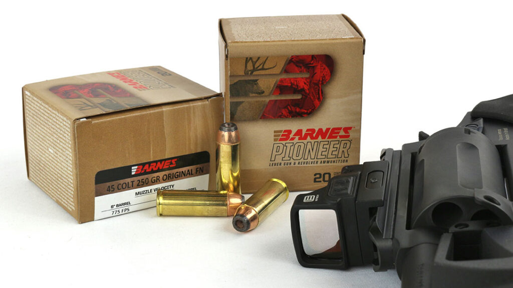 Hailing from the new-for-2023 Pioneer line, this family is built for easy loading into revolvers and lever-action rifles. Yet, it still delivers outstanding performance on game. The .45 load appears to feature a jacketed hollow point bullet. However, Barnes categorizes it as a jacketed flat-nose projectile.