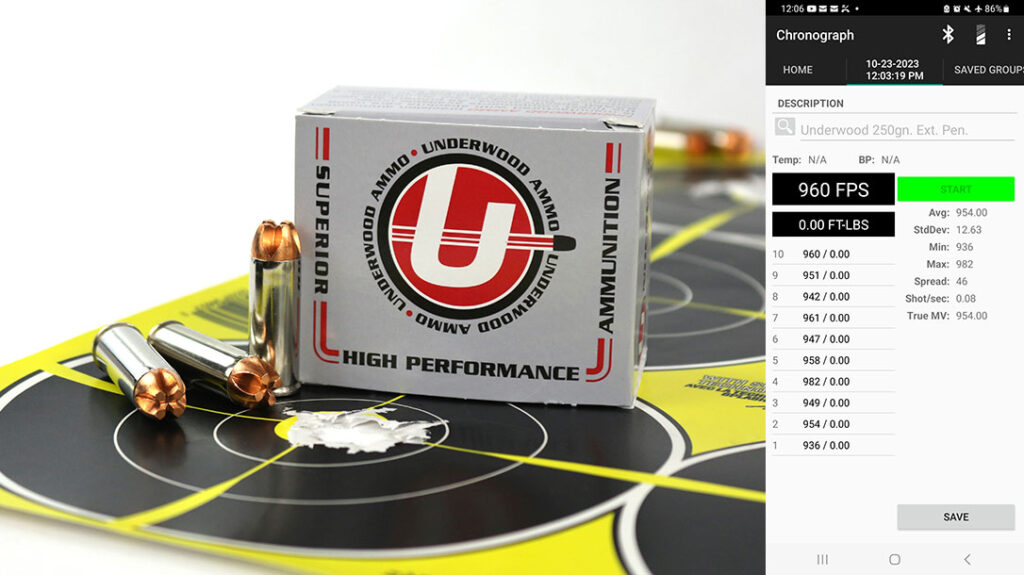 This load from Underwood is built with the 250-grain variant and left our Judge Home Defender at 954 feet per second. Despite their crazy-looking profile, they were darned accurate, too. Thus putting them in the top third of the chart that day.