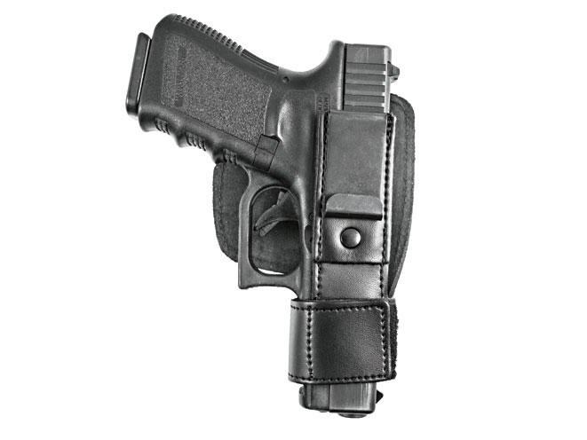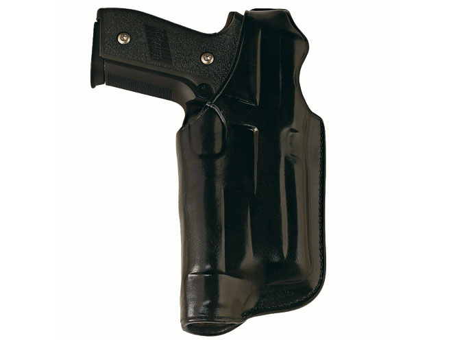 GALCO: Galco’s Halo Belt Holster will hold a full-sized, railed 1911 with a weapon light in place, and can be concealed. The Halo is constructed of premium saddle leather, fits belts up to 1.75 inches wide and is available in right hand designs, in black. (http://www. galcogunleather.com; 800-874-2526)