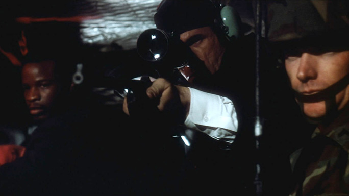Featuring old school night vision, this rifle, appearing to be a Steyr SSG 69, nearly clipped our hero early on. We’re not sure how many SWAT Teams truly employed this rifle back in the day. Likelihood remains low for most. But it sure proved a cool choice in the movie.