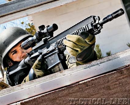 In addition to the select-fire FN SCAR Heavy MK17 carbine with a 16-inch barrel, the semi-automatic FN MK20 Sniper Support Rifle (SSR) can also be used as a Designated Marksman Rifle. The MK20 includes the following features: a chrome-lined, cold-hammer-forged, 20-inch barrel, an extended, monolithic hardcoat anodized upper receiver with a Picatinny rail system that has attachments at the three, six, nine and 12 o’clock positions, a side-folding retractable stock that is equipped with an adjustable cheekpad, a pistol grip, a reciprocating, ambidextrous charging handle and an adjustable single/two-stage trigger. The MK20 upper receiver can accommodate folding iron sights, various in-line day and night sniper optics and devices, and other accessories as required. The SSR is available in Flat Dark Earth, utilizes 10- and 20-round magazines and can be easily operated with a suppressor. (fnhusa.com)