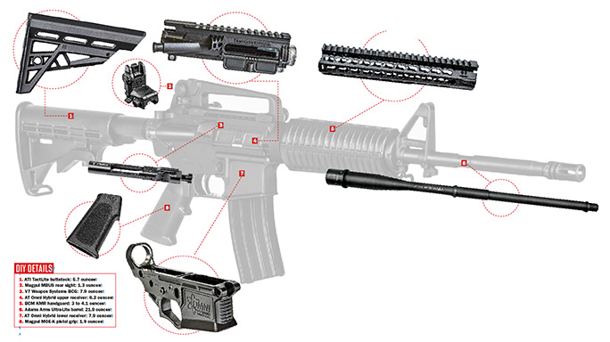 You can get a titanium A2 flash suppressor, an ultra-light forward assist, a featherweight polymer ejection port cover and an aluminum port door retention rod, a titanium grip screw, a hybrid safety selector, a titanium buffer retainer pin, aluminum takedown pivot pins, an ultra-light bolt and magazine release, and titanium castle nuts, end plates, and trigger and hammer pins. This may not seem like a lot of weight savings, but each of these parts weighs 40- to 60-percent less than their mil-spec steel counterparts.