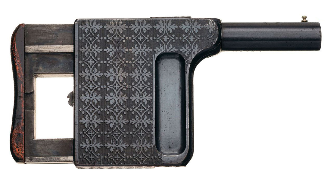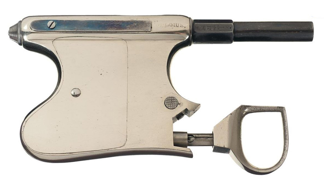 Invented in Italy in 1890 by Catello Tribuzio, this all-metal, ring-trigger pistol loads from the top into a vertical magazine. It was available in 7mm or 8mm, and both variants came equipped with a 2-inch barrel.