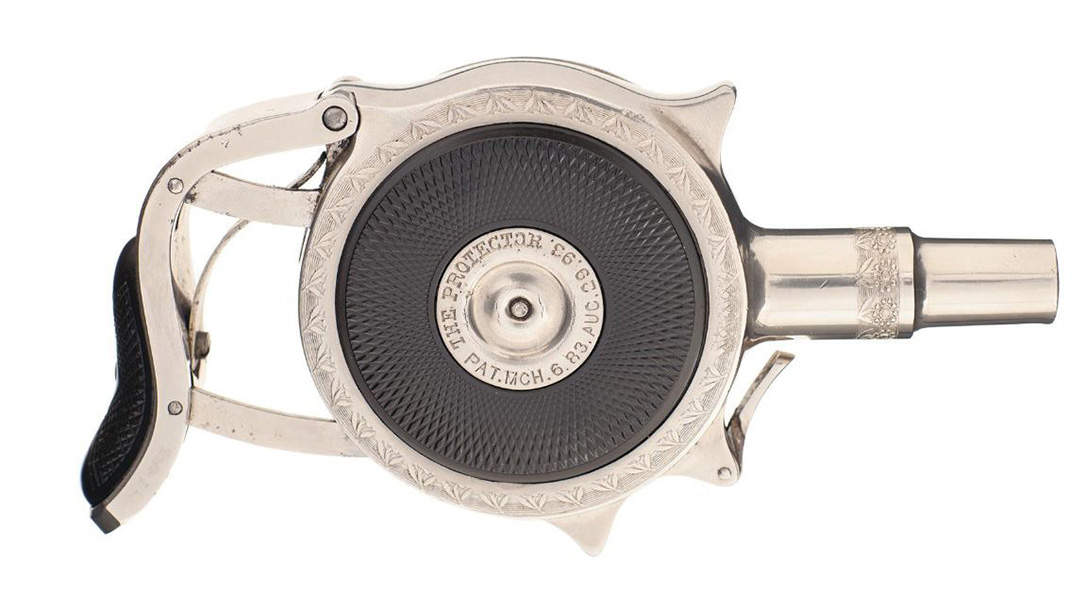 By far, the most widely known example of palm pistols is the Protector variant. First patented in 1883 in the United States, the design would go on to become patented in Belgium, Italy, England and France. Two geographically named companies sold the guns in the U.S.: the Chicago Fire Arms Company and Minneapolis Fire-Arms Company.