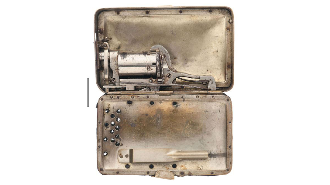 Designed for women in 1877, the Frankenau was marketed in the United States as a pocketbook revolver. In England, it was called a purse revolver. No matter what you choose to call it, the gun is exactly what it sounds like. One side of the device houses a 5mm pinfire revolver. The other side really is a pocketbook.