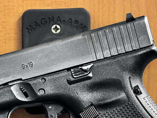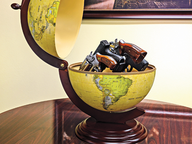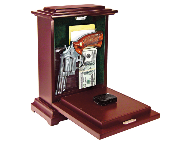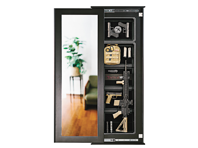 For homeowners with some small amount of skill and in need of more storage space than for just a single handgun, Tactical Walls offers a tough, molded ABS plastic compartment in different sizes that are designed to fit between the studs of a standard 2×4 wall. All you have to do is find the studs, cut a hole in the drywall and install the Tactical Insert. To keep it hidden, you can cover it with clothing (in a closet) or a painting, a mirror or another piece of wall art. The company also sells complete units with sliding mirror covers that can include a magnetic lock as well. Similarly, a renter’s version is available that does not require any permanent modifications to your walls.