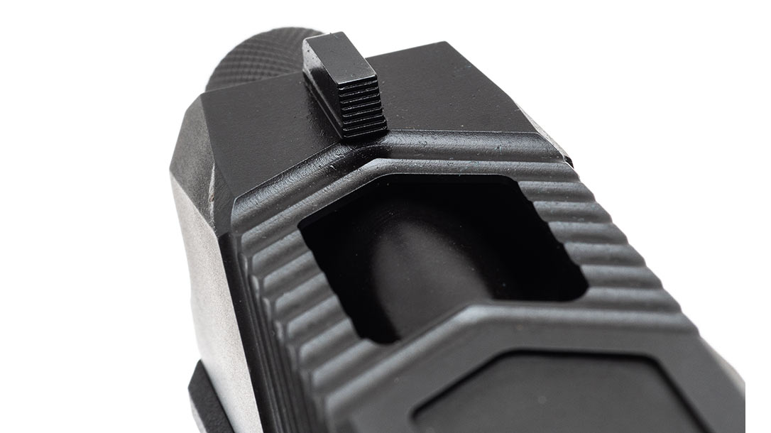 The machining on top of the slide includes serrations and a chevron-shaped window cut out to expose the barrel. This was done intentionally to reduce the amount of reciprocating mass and to deliver a flatter shooting experience.