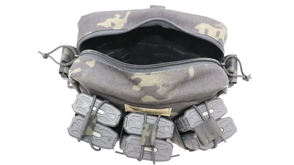 Additional features include a heavy-duty, military-grade zipper for easy access to the main compartment, a rear slit pocket that accommodates most pistols and is covered with MOLLE Loop Velcro, and an adjustable webbing strap that facilitates effortless grab-and-go deployment. This has been crafted in the USA, ensuring top-notch quality and supporting American workers.