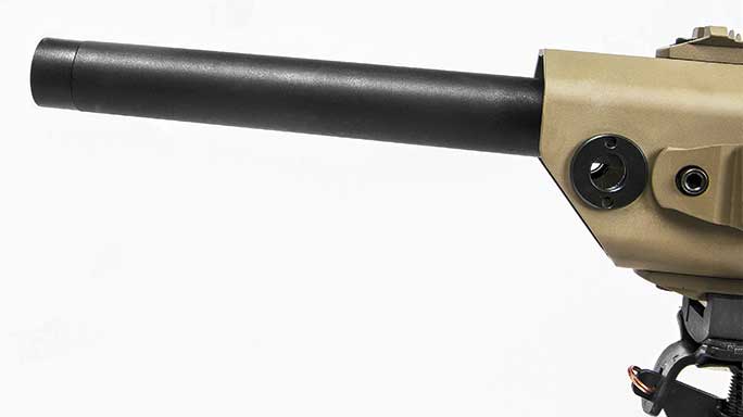 Lilja barrels are among the best, and the Interceptor uses a 26-inch, stainless steel, match version with a contour duplicating Remington’s Sendero. Opinions on this type of rifle’s barrel length vary a lot, so AdeQ offers other lengths as custom options. The 5/8×24-tpi threaded muzzle  wears a thread protector and ends with an 11-degree match crown. Fitted to a trued and blueprinted Remington 700 action, the Lilja barrel has a 1-in-10-inch twist rate. My test rifle came chambered for the 7.62mm NATO cartridge.