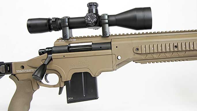 My test AdeQ Interceptor arrived with a Harris bipod attached—perfect for working from a bench or prone. The rifle also came with a Leupold 4.5-14x50mm Mark 4 LR/T scope with a TMR reticle. Crisp and clear, the Mark 4 offers excellent visibility and enough magnification to make printing nice groups at 100 yards easier. The Mark 4 would be just the ticket for LEO use.