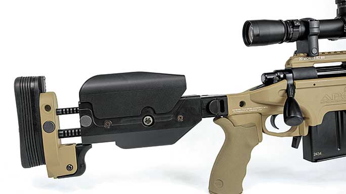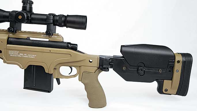 For these purposes, the Interceptor uses the SABER-FORSST MOD-1 modular rifle chassis system from Ashbury Precision Ordnance (APO), which perfectly cradles the action and leaves the barrel free-floating. The ergonomic SABER-FORSST chassis is certainly rigid, and it’s precision-manufactured from aerospace-grade alloys, advanced composites and super-strong carbon-fiber materials. The alloys used are primarily 7075-T6 and 6061-T6 aluminum, and the chassis utilizes a “bedding-less” action interface technology that ensures the action is perfectly bedded. Because of the SABER-FORSST’s modular design, users can easily interchange the buttstock, center chassis and forend for other versions. The chassis can also be adjusted to fit different users or firing positions. The buttstock is adjustable for length of pull (the LimbSaver recoil pad extends up to 2 inches), recoil pad height and cheek height. The stock also folds to the left side to make the rifle more compact for transportation and storage. Also, the Ergo pistol grip’s angle and trigger reach can be adjusted with inserts.