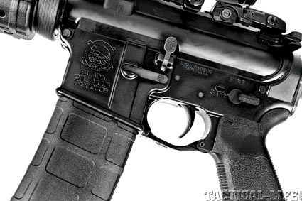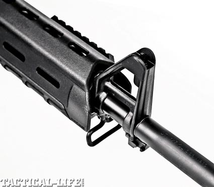 The upper and lower receivers on the Paladin fit snugly. AdeQ also equips the rifle with a Magpul rear sight and 30-round PMAG.