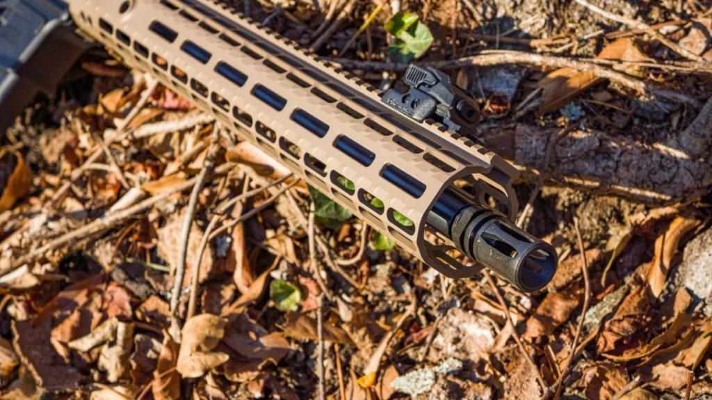 Alternately, you can skip all the boring assembly and buy complete lowers in either rifle or pistol configuration. Standalone barrels are available, or opt for a complete upper. The review rifle’s complete upper has a coyote tan finish. Additionally, it features Aero’s Enhanced M-LOK handguard, and an A2 style compensator.