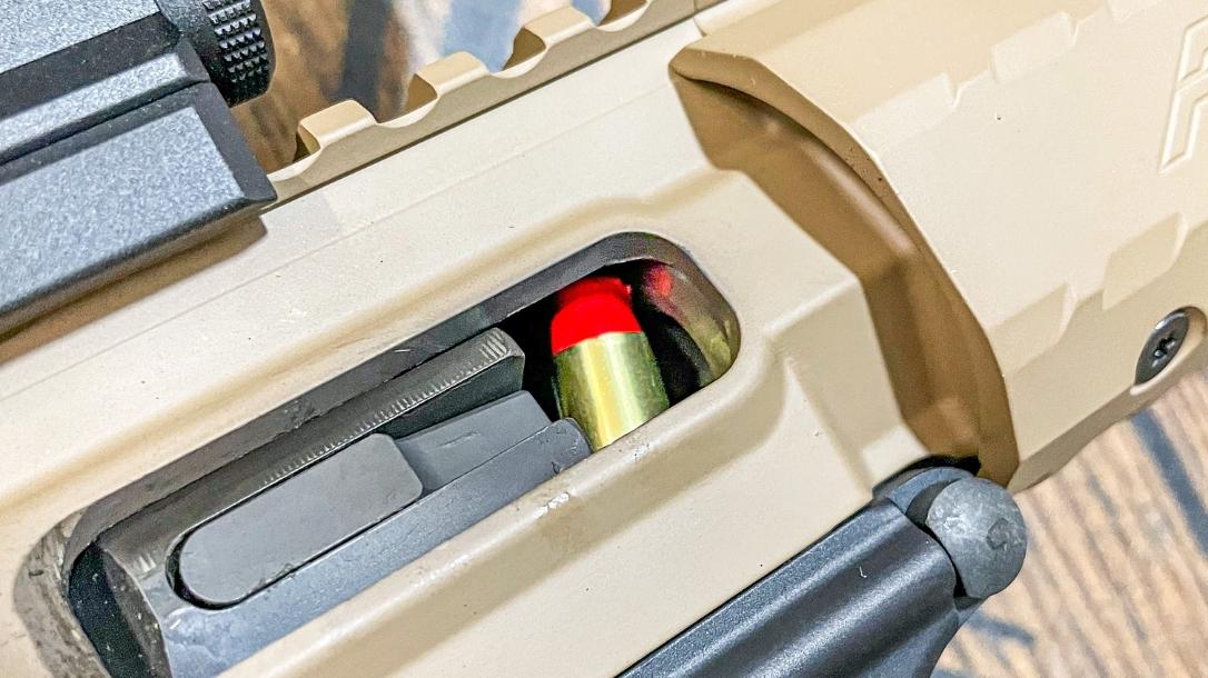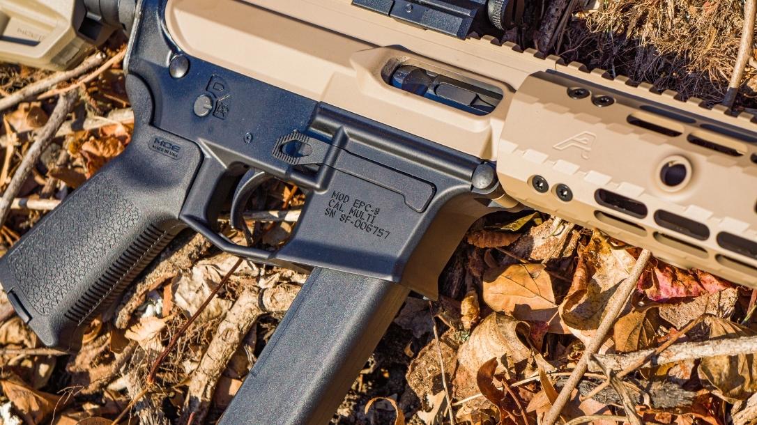 Engineered from the ground up to accept Glock magazines, the EPC’s lower receiver also comes with additional nice features. When you buy the complete lower, you get a Magpul pistol grip that pairs with the enlarged trigger guard. All the 7075-T6 Aluminum forged lowers include the enlarged magazine release, along with a nicely beveled magwell. Our review rifle uses a black receiver, creating a nice “chocolate chip” appearance on the gun.