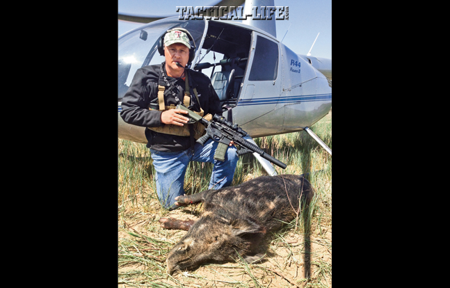 Typically, I sight this scope so that the point of the amber-triangle reticle is dead on at 100 yards, but for this hunt I made some changes. I adjusted the reticle so that the center of the amber triangle covered the point of impact at 40 yards. That way, whenever I painted moving targets with the triangle, that’s where the bullets struck—usually. Whenever I had to adjust my lead based upon the helicopter’s speed and angle of approach, as well as the direction of a running quarry, shots could get kind of tricky. It didn’t take me long to get the hang of it. Most times I waited until I got the shot I wanted instead of spraying and praying. That helped keep my hit ratio hovering around 50 percent. All told, I killed just over 50 hogs with this setup before the hunt was over.