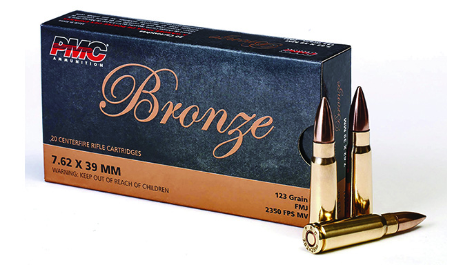 Precision Made Cartridges (PMC) offers the Bronze ammunition line for high-volume 7.62x39mm shooting. These 123-grain FMJs produce a muzzle velocity of 2,350 fps from a 20-inch barrel. Despite its economical price, the Bronze line of ammunition is made to the same high standards as PMC’s offerings. All of the cartridges use new, reloadable brass cases and boxer primers. PMC makes the rounds to SAAMI or military standards with strict quality-control procedures. For more information, visit https://pmcammo.com