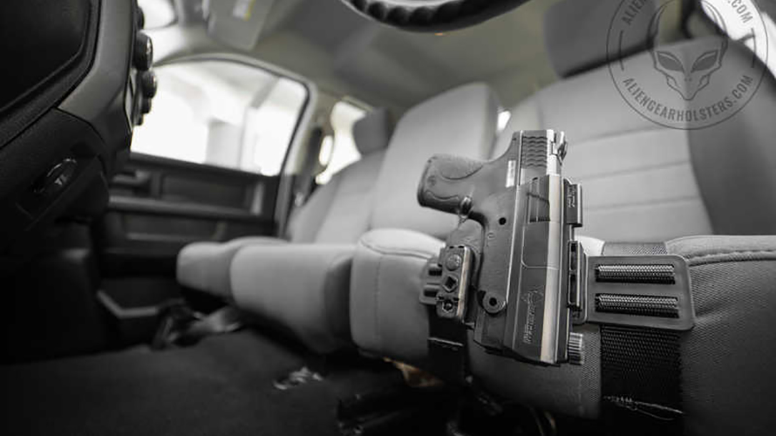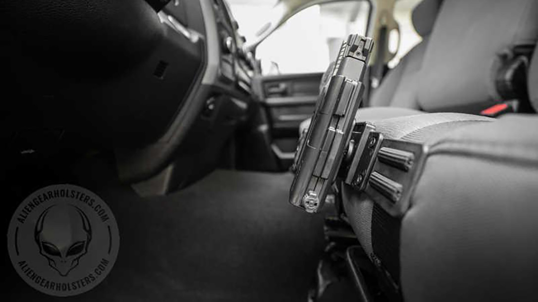 “The Driver Defense Holster was developed as a solution for those who want less cosmetic changes to their car’s interior, but the same stability you would achieve with other mounts,” Alien Gear Holsters mechanical engineer Jacob Shearer said. “With the holster positioned in the center of the seat, you can sit comfortably in your car for hours on end while ensuring fast and easy access to your weapon.”
