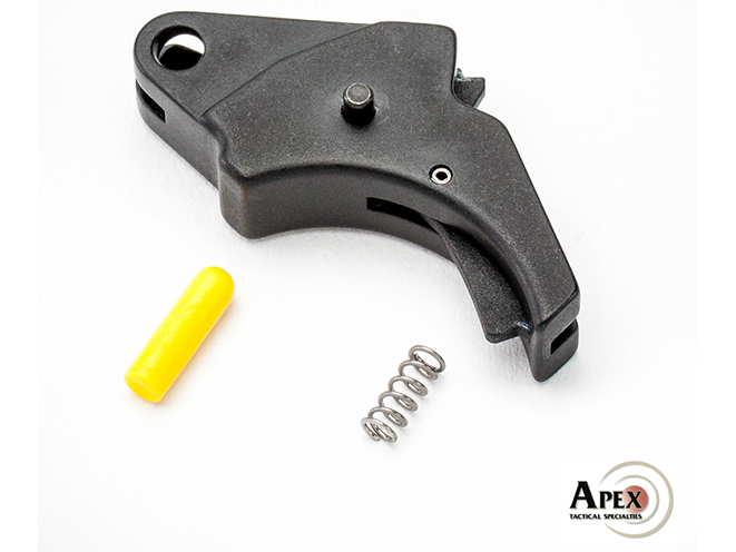 The Apex Action Enhancement Trigger & Duty/Carry Kit — available with either a polymer or aluminum trigger body — replaces the M&P M2.0’s factory hinged trigger with the “more ergonomic and responsive” Apex trigger, the company says. It features a center-mounted pivoting safety and delivers a smoother trigger pull, with a 30 percent overall reduction in trigger travel. Not only that, but trigger reset length is shortened and the trigger pull weight is reduced by around one pound from the M&P M2.0 factory setting. This gives the shooter a duty and carry pull weight in the 5.0 to 5.5 lbs. range.