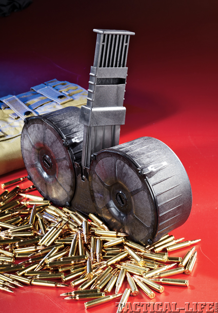 The Armatac Saw-Mag, featuring a tough polymer body, provides the AR-pattern carbine with a 150-rounds of 5.56x45mm firepower.