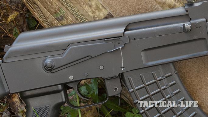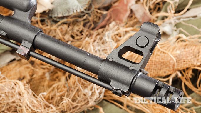 The left side of the receiver hosts a typical AK scope rail, which complements the standard AK-style front and rear sights. A bayonet lug and cleaning rod are also included.