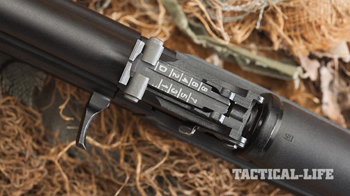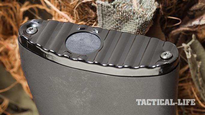You’ll notice that the polymer buttstock has an internal storage compartment, accessible through the buttpad, for spare parts or a cleaning kit. This is a handy feature that stays out of the way yet is easy to access when needed. The metal buttplate adds additional durability and protection from cracking. The grooves in the buttplate help lock the rifle into your shoulder while aiming, which can help you get back on target quickly for follow-up shots downrange.