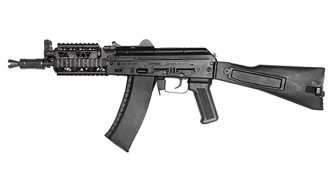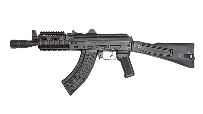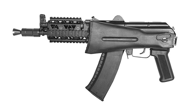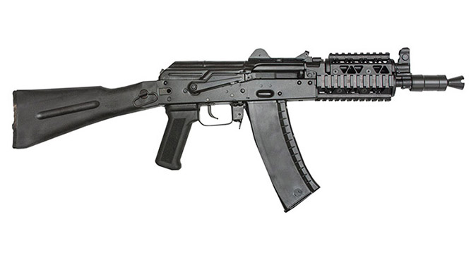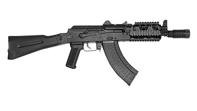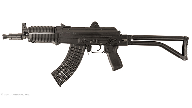 Arsenal’s SLR-104UR SBR, meanwhile, is chambered in 5.45×39.5mm. Similar to the SAM7SFK, the chrome lined hammer forged barrel here measures 8.5 inches in length. Also included is a stamped receiver; short gas system; front sight block / gas block combination; left-side folding black polymer buttstock; 2 stage trigger; cleaning rod; and a scope rail. This model sports Arsenal’s PR-03 Picatinny quad rail handguard system for attaching accessories. MSRP: $2,049.99.