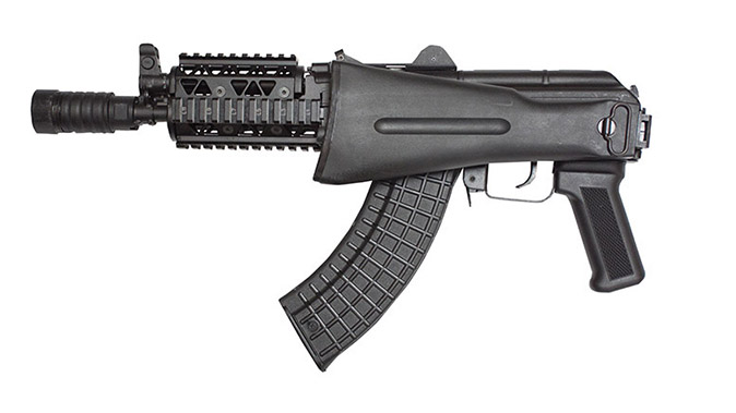 The SAM7SFK SBR is chambered in 7.62x39mm. It boasts a Bulgarian hot-die hammer forged receiver, bolt, bolt carrier and double-hook trigger. Also included in this feature-rich SBR is a chrome lined hammer forged 8.5-inch barrel; short gas system; front sight/gas block combo with 24×1.5mm right-hand muzzle threads; removable cone flash hider; right-side folding tubular buttstock; black polymer furniture; ribbed polymer handguards; stainless steel heat shield; ambidextrous safety; peep rear sight; and scope rail. It ships out with a 30-round magazine, in addition to a sling, oil bottle and a cleaning kit. The MSRP is $2,499.99.