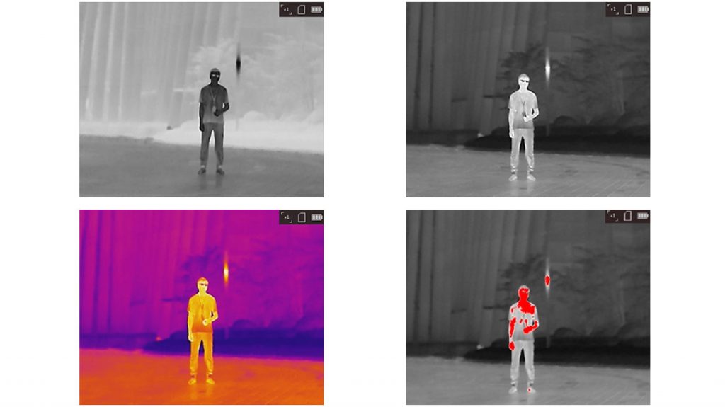 The thermal imaging is represented in three different color modes—White Hot, Black Hot and Color. Although the color mode has two different representations. The heat tracking feature detects the highest temperature spot in the scene and marks it on the display, as well.