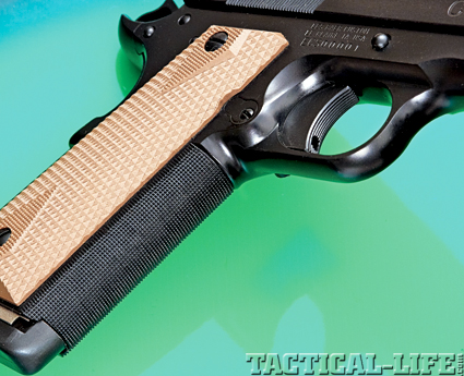 Attention to detail is shown in the fine line checkering on the frontstrap. A small alteration to the area behind the triggerguard allows the handgun to sit a little lower in your hand.