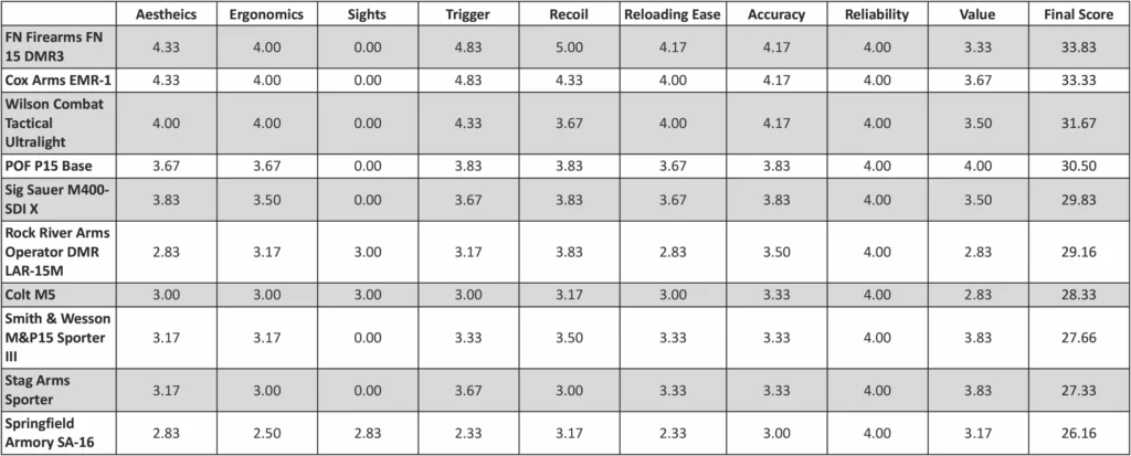 This Ballistic’s Best category looks at AR15 rifles. The testing parameters are provided to us by the Ballistic Magazine staff and are pretty straightforward. Each category covered something that people in the AR market look for. The scale was set at 0-5, with the opening point being 3. That means every gun came in as a three and gained or lost points as the evaluation went on. The only significant score drop was in the category of sights. If a gun arrived without backup sights, it was automatically dropped to a zero in that category. The rest of the categories for Ballistic’s Best AR15-2024 , including value, are self-explanatory.