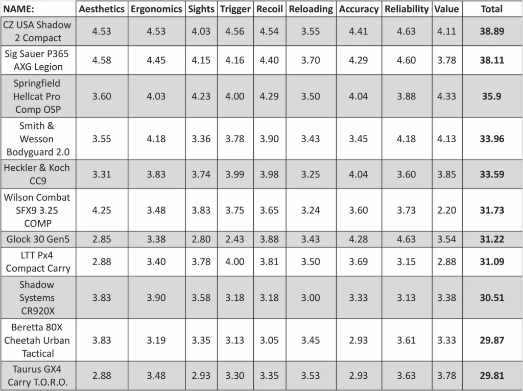 All 11 pistols for the Compacts category were evaluated on nine different criteria such as Aesthetics, Ergonomics, Sights, Trigger Control, Recoil Control, etc. Each pistol was given a rating from 1 to 5 for each criterion. We used one-tenth increments such as “4.6” to try and avoid any ties. A rating of “3” is basically the starting point. It’s neither bad nor particularly good. It means the pistol got an average rating for the specific criteria or that the evaluator feels the user is basically getting what they paid for and what you would normally expect at that price point.