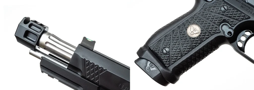 Being a lighter, polymer-framed pistol, the Rival isn’t the typical competition pistol, and it has a decent amount of muzzle flip. The TTI Combat model was designed with an attached compensator to help overcome that issue while keeping the relatively light weight. In keeping with the performance enhancements, the TTI Combat includes a serrated and ambidextrous slide stop, a spiral-flute barrel, an aggressively textured slide with front and rear cocking serrations, aggressive grip texturing, and an aluminum mag well.