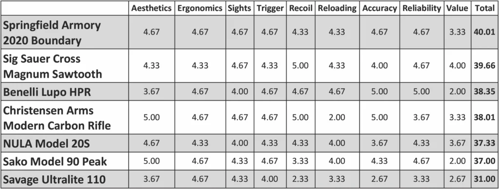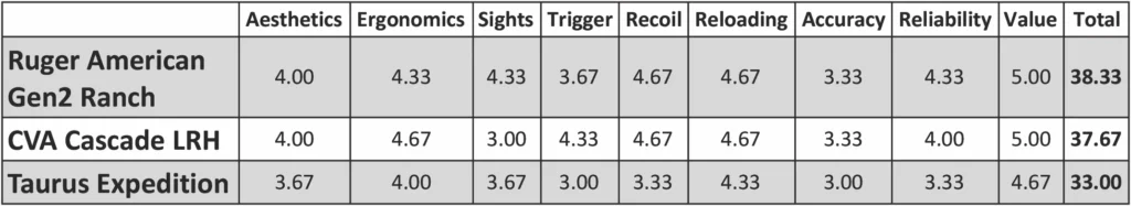 Again, each of these rifles earned a score of 1 to 5 points each for aesthetics, ergonomics, sight mounting ease, trigger, recoil control, reloading ease, accuracy, reliability and value to price.