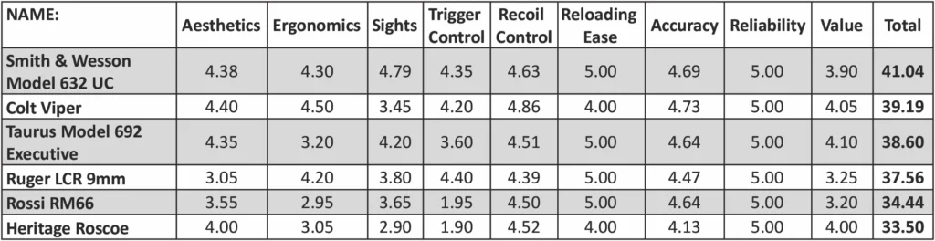 As in previous years, the evaluators scored each revolver in nine different categories. The scoring range was from one to five with a total maximum score of 45 points. Prior to any range work, the revolvers were scored on aesthetics, ergonomics, sights, trigger control, and value. The scores were made blind, without any evaluator knowing what other scores had previously been assessed. After the range testing, evaluators were allowed to revise their scores, particularly for ergonomics, sights, and trigger control.