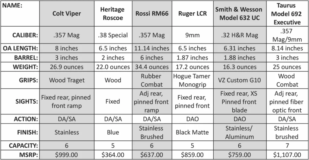 The line-up for this year consisted of the Colt Viper, Heritage Roscoe, Rossi RM66, Ruger LCR 9mm, Smith & Wesson 632 Ultimate Carry, and Taurus 682 Executive Grade. There were several other models that we would have liked to include but circumstances prevented that from taking place.